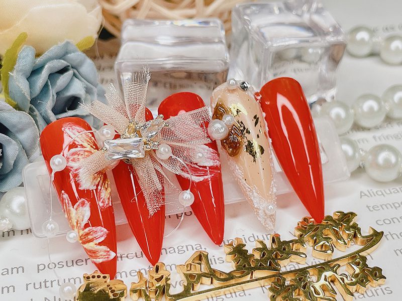 粉红花瓣悄然飘着,亮钻排列如心状修饰嫩红色甲面。怦然心动的爱情蜜意,撩动你的心。